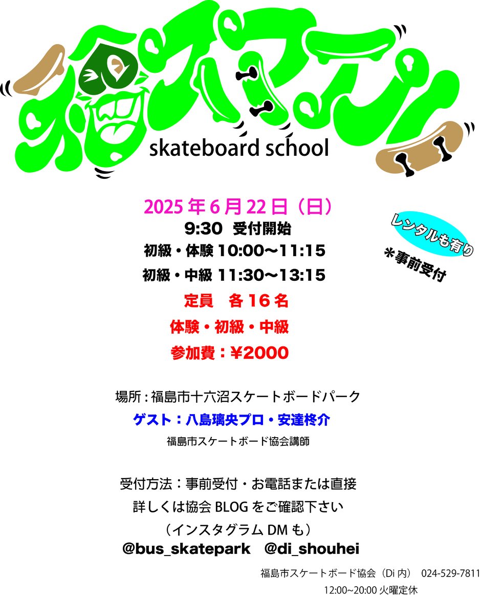 | お問い合わせ | 福島市スケートボード協会事務局 スケートショップ ディーアイ tel 024-529-7811 インスタグラム @bus_skatepark |
