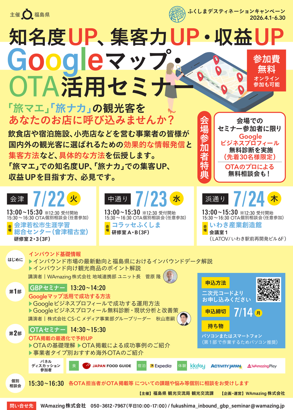 | お問い合わせ | WAmazing株式会社 TEL 050-3612-7967(平日10:00-17:00) MAIL fukushima_inbound_gbp_seminar@wamazing.jp |