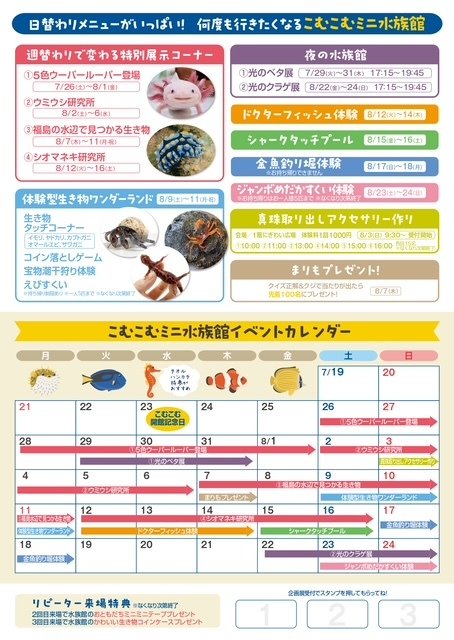 リピーター来場特典もあります。 2回目来場で水族館のおともだちミニミニテーププレゼント。3回目来場で水族館のかわいい生き物コインケースプレゼント。企画展受付でチラシの裏側にスタンプを押してっもらってくださいね。