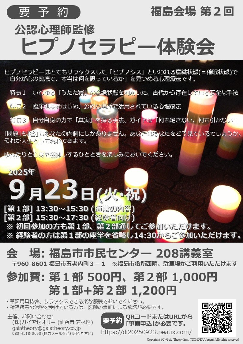 | お問い合わせ | (株)ガイアセオリー (仙台市 若林区) gaiatheory@gaiatheory.co.jp 080-4518-0690 (電話に応答できない時間がありますので、できる限り メールか申込サイトのメッセージ機能をご利用ください) |