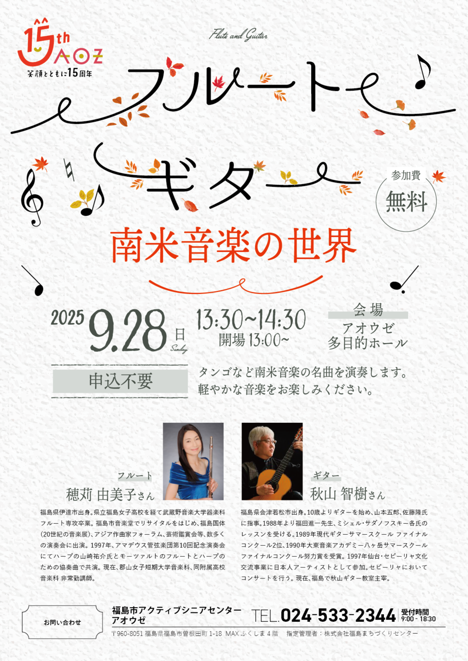 | お問い合わせ | お問い合わせ 福島市アクティブシニアセンター・アオウゼ 024-533-2344(受付時間:午前9時~午後6時30分) |