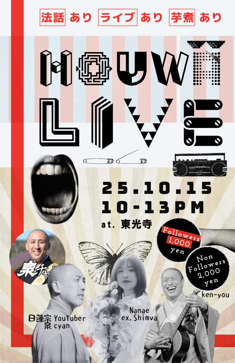 出演は、登録者11万人超の人気住職YouTuber・泉チャン、ギターを奏でる宮崎の住職・ken-you、そして福島出身のシンガーソングライター Nanae ex. Shimva。仏教の智慧と音楽の響きが交わる、ここでしか体験できないライブをお届けします。