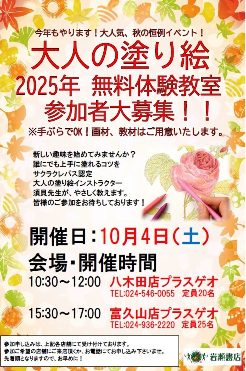 10月4日(土)大人の塗り絵無料体験教室 参加者大募集!!