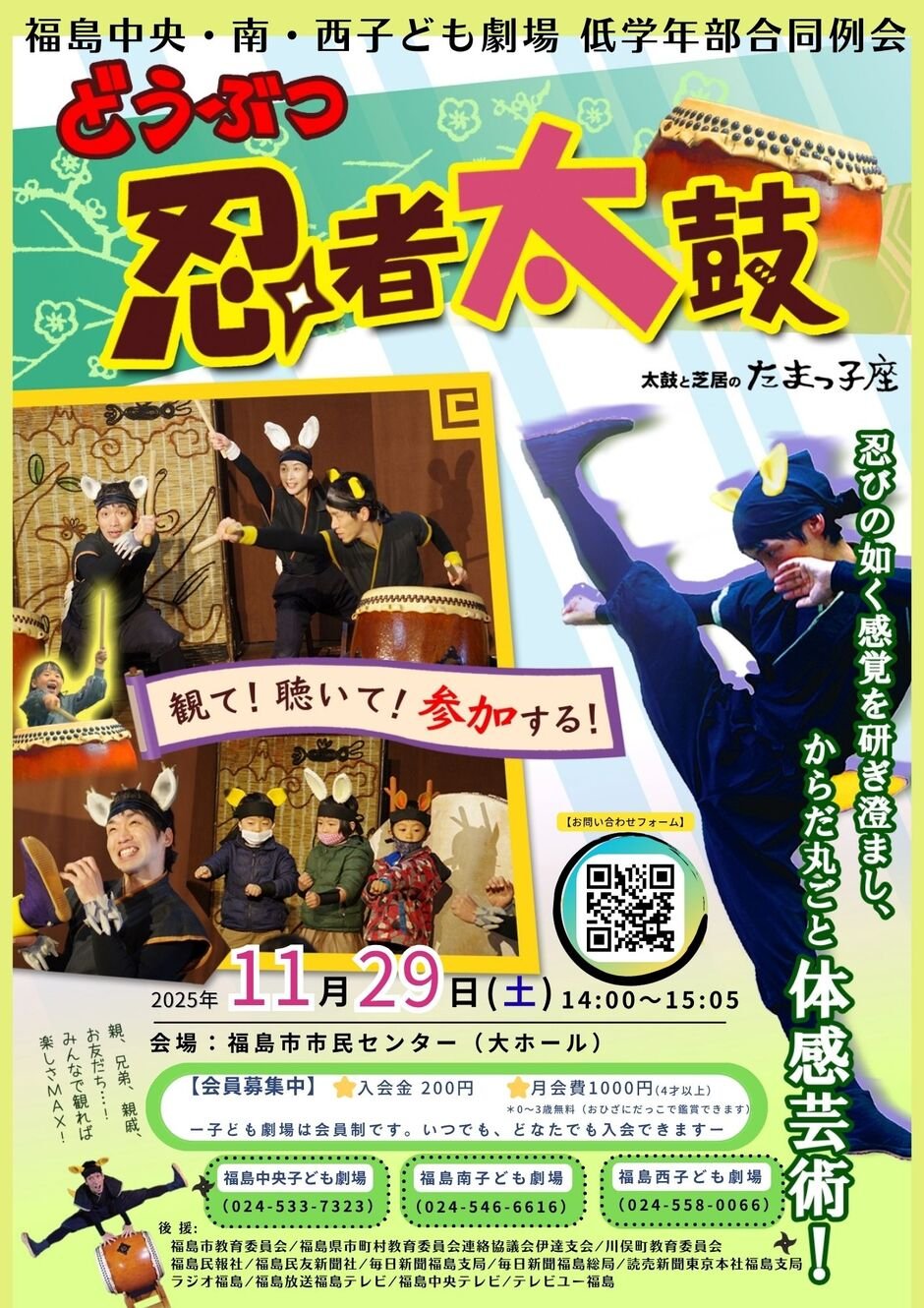 | お問い合わせ | ●福島中央子ども劇場 024-533-7323 ●福島南子ども劇場 024-546-6616 ●福島西子ども劇場 024-558-0066 お近くの地区の劇場にお問い合わせください。 |