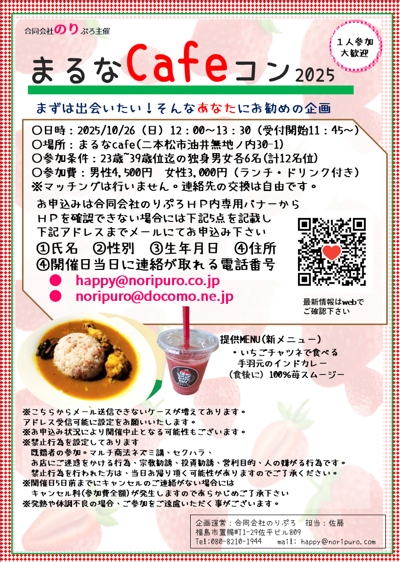 | 参加費 | 男性4,500円 女性3,000円 |