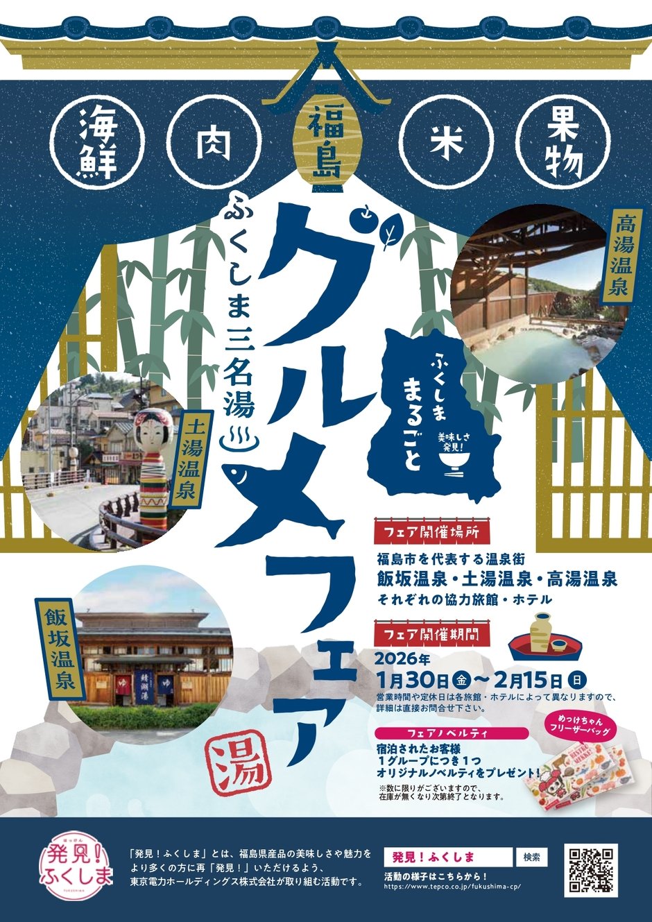 | 場所 | 福島市を代表する温泉街「飯坂温泉」「土湯温泉」「高湯温泉」それぞれの協力旅館・ホテル |