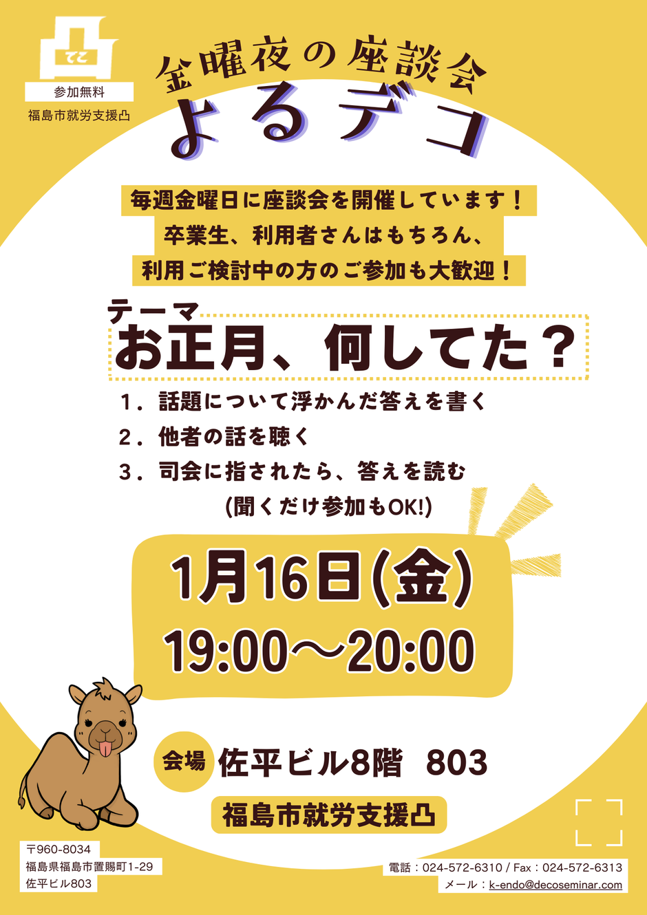 | お問い合わせ | 福島市就労支援凸 電話:024-572-6310 / Fax:024-572-6313 メール:k-endo@decoseminar.com |