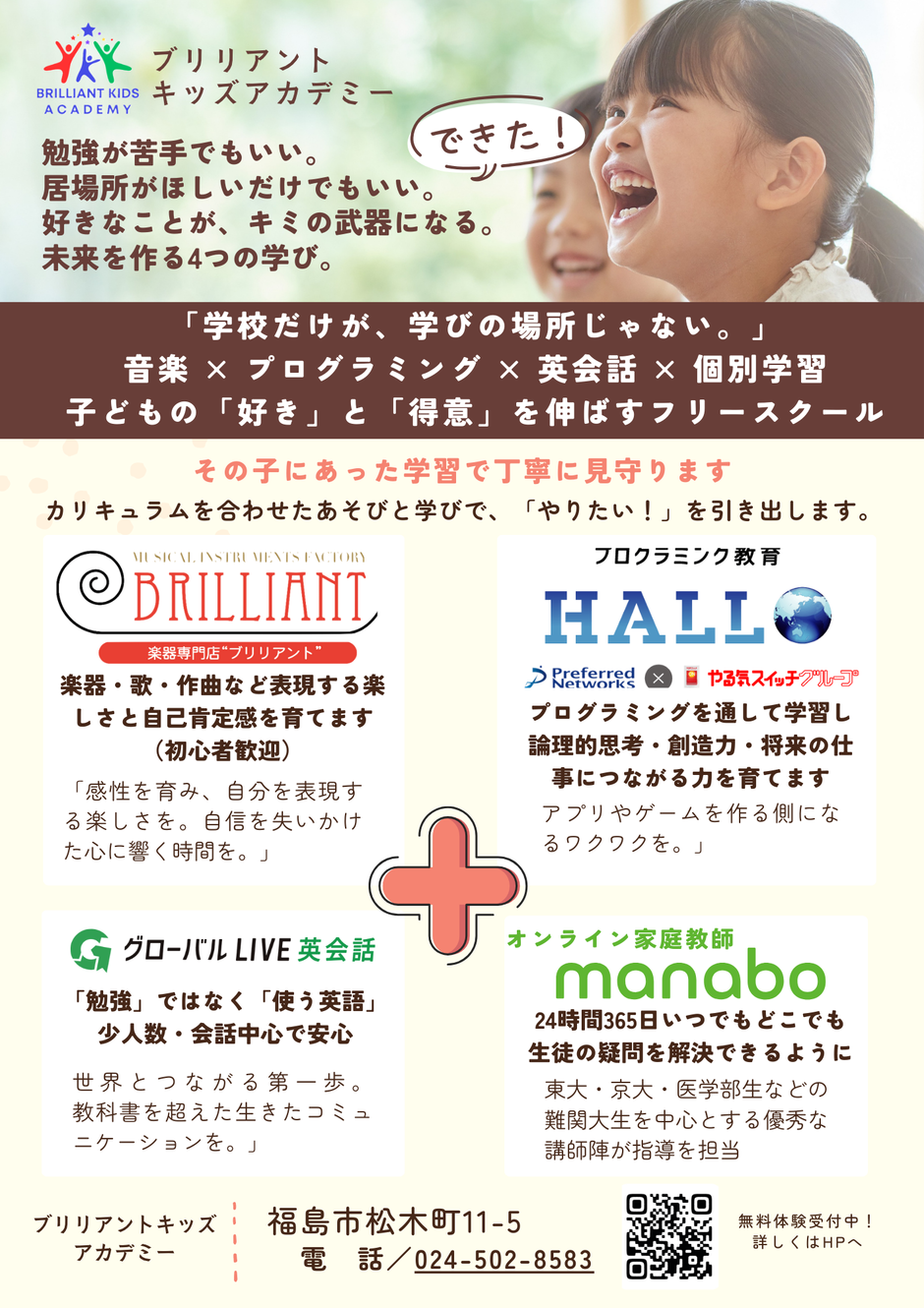 | お問い合わせ | 株式会社 ブリリアント ブリリアントキッズアカデミー ブリリアントフリースクール 福島市松木町11-5 TEL:024-502-8583 Mail:info@brilliant-ka.com |