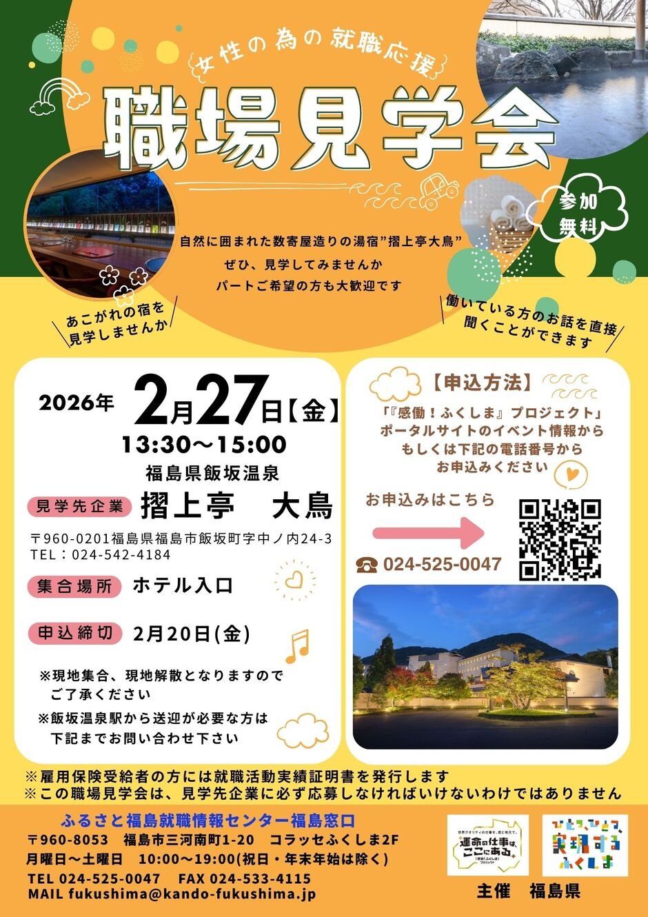 | お問い合わせ | ふるさと福島就職情報センター メール fukushima@kando-fukushima.jp 電話 024-525-0047 福島県福島市三河南町1-20コラッふくしま2階 |