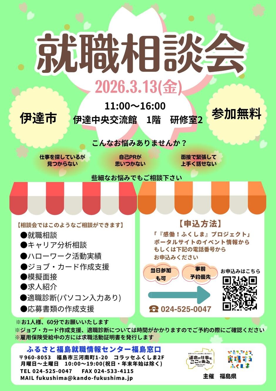 | お問い合わせ | ふるさと福島就職情報センター (ジョブカフェふくしま) メール fukushima@kando-fukushima.jp 電話 024-525-0047 |