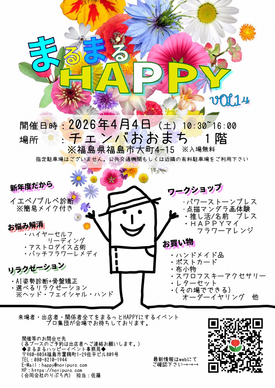 | お問い合わせ | 開催等のお問合せ先 (各ブースのご予約は出店者へご連絡お願いします。) ◆まるまるハッピーイベント事務局◆ 〒960-8034福島市置賜町1-29佐平ビル809号 TEL:080-8210-1944 E-Mail:happy@noripuro.com HP:https://noripuro.com (合同会社のりぷろ内) 担当:佐藤 |