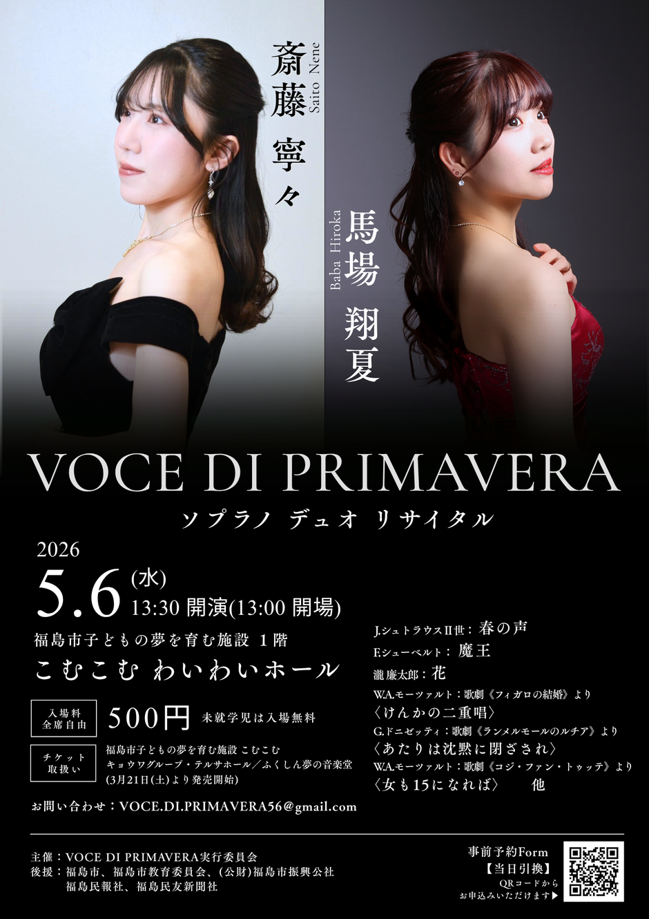 | お問い合わせ | 【主催】 VOCE DI PRIMAVERA実行委員会 【後援】 福島市/福島市教育委員会/(公財)福島市振興公社 福島民報社/福島民友新聞社 【お問い合わせ】 VOCE.DI.PRIMAVERA56@gmail.com |