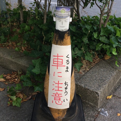 福島市内の交番の軒先にある三角コーン。よーっく見ると小さなお巡りさんが目をキラリと光らせていました^ ^ みなさん、車に注意ですよー!